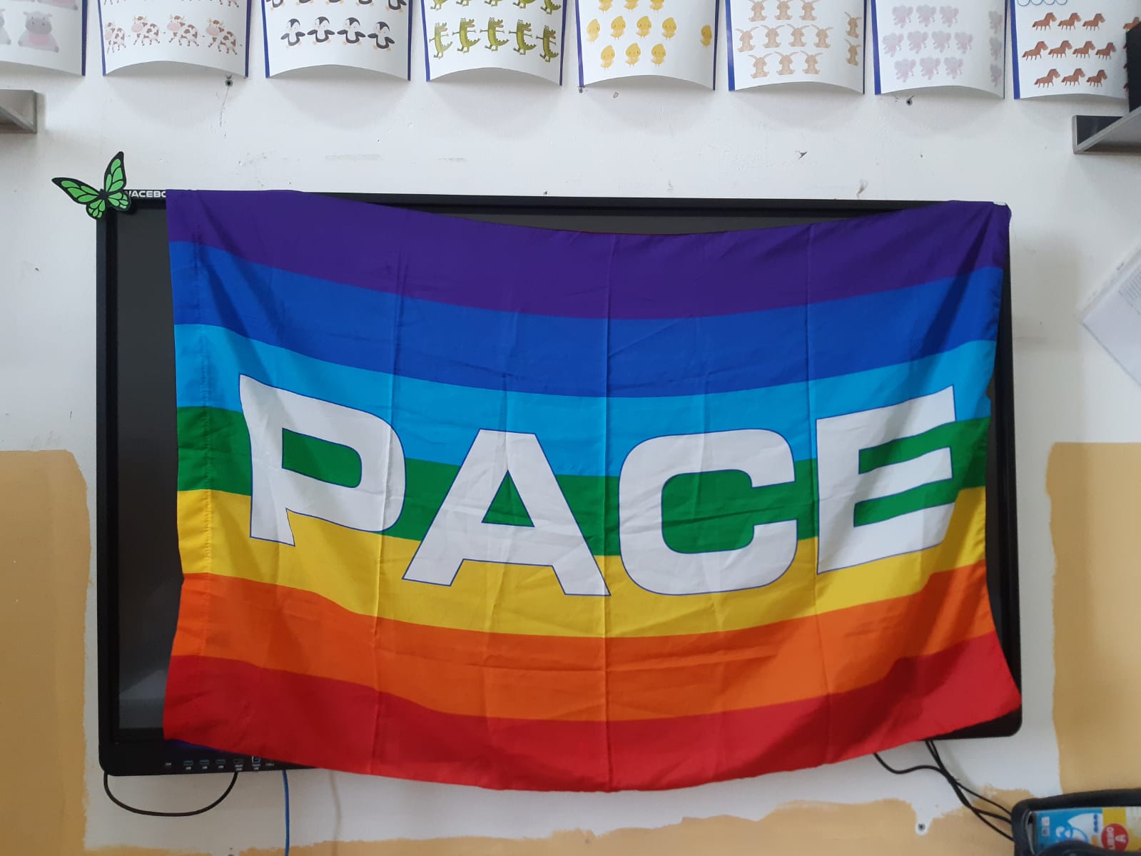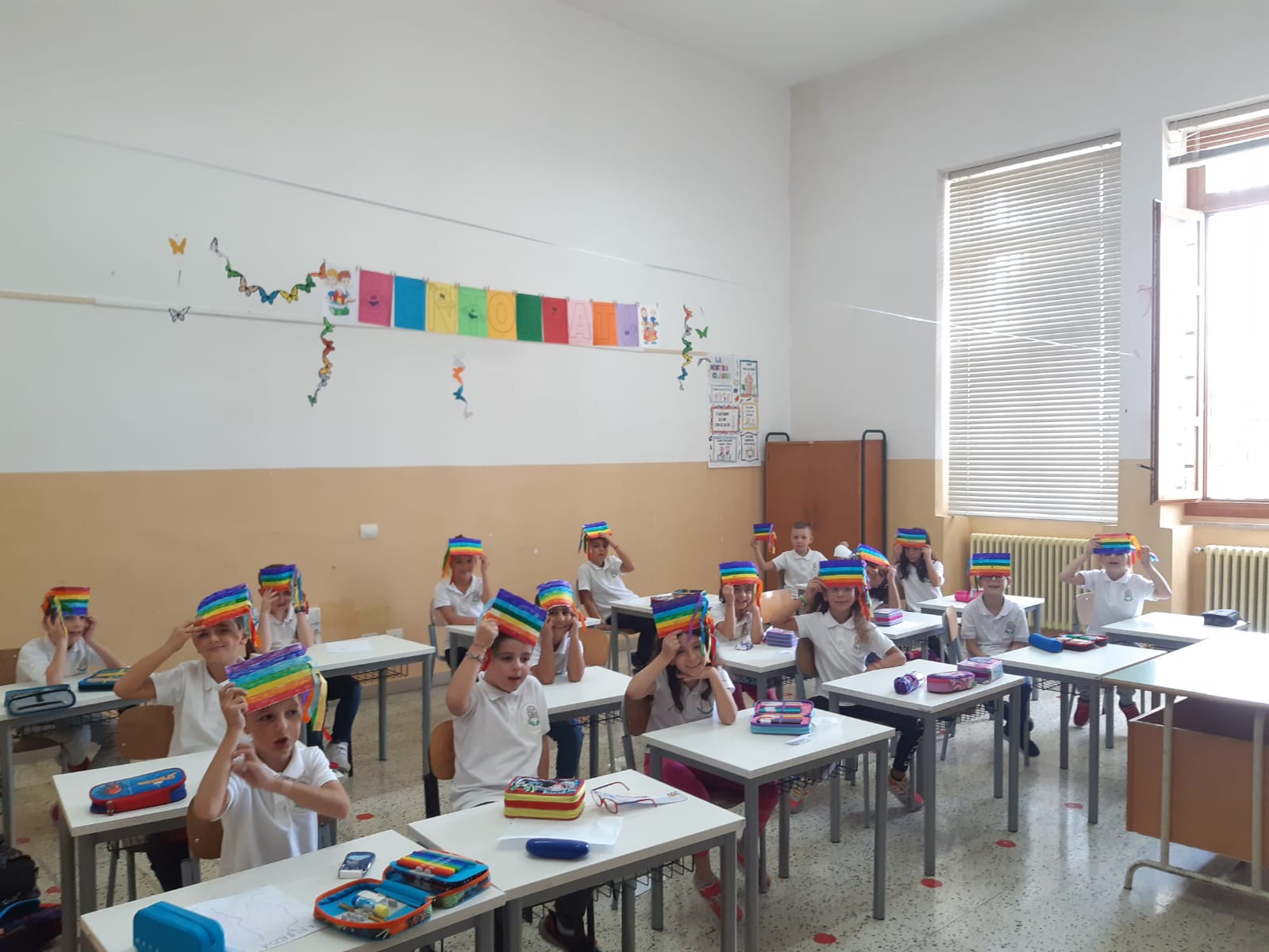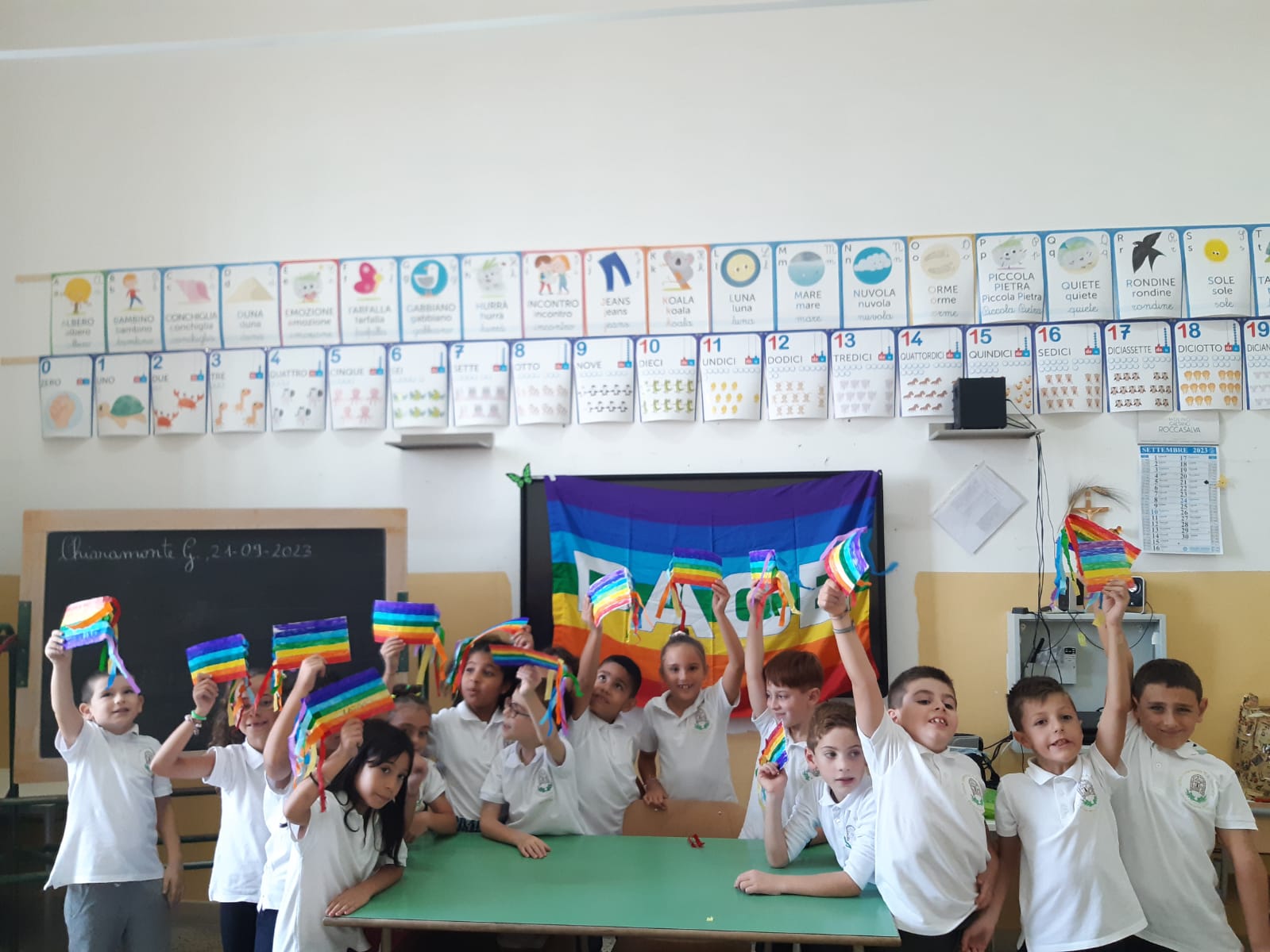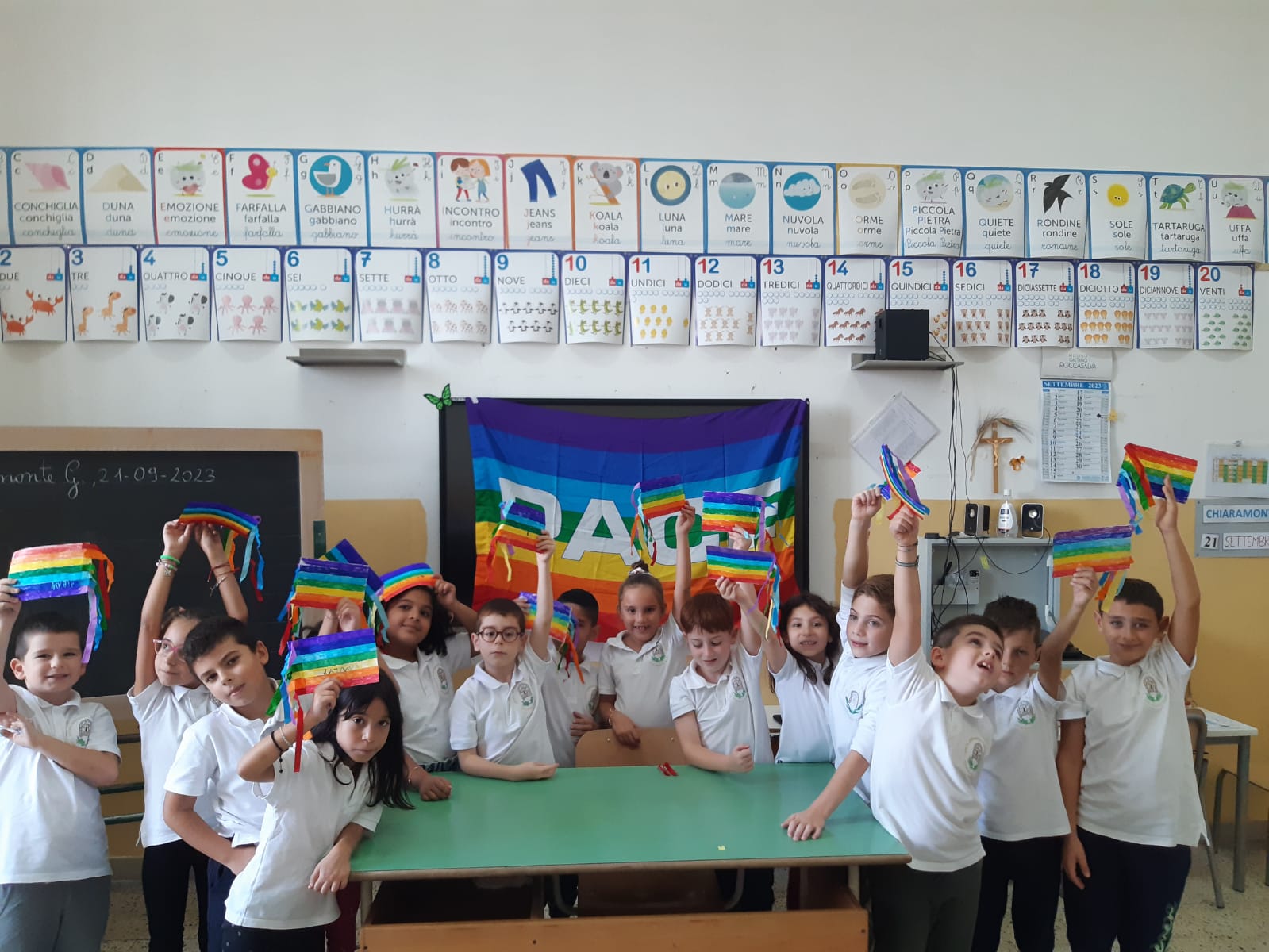 Gli alunni della classe 2A del plesso San Giuseppe, dopo aver discusso in classe sul significato della parola Pace, hanno visto un video sul significato dei colori della bandiera per poi realizzare la bandiera della Pace.