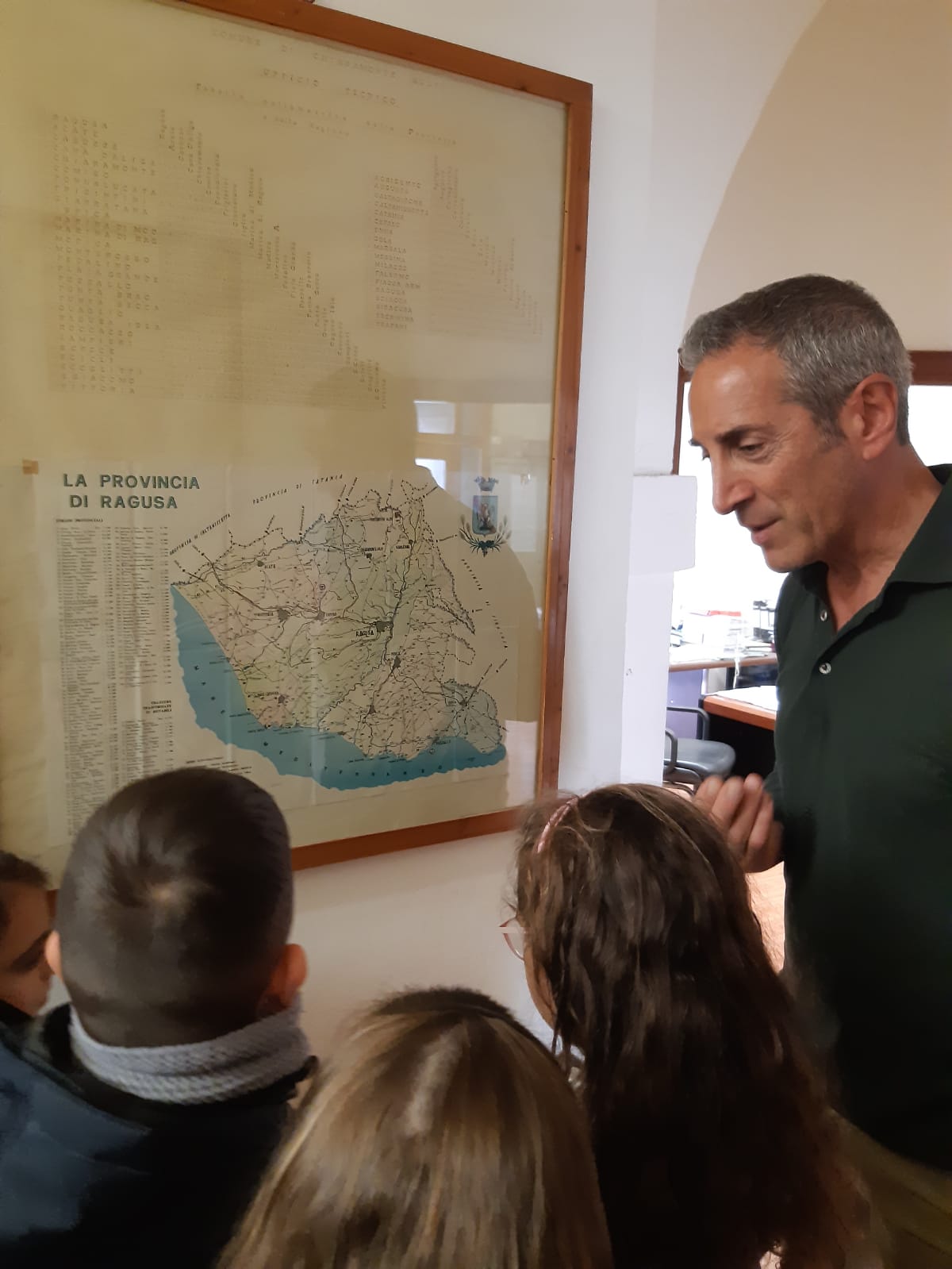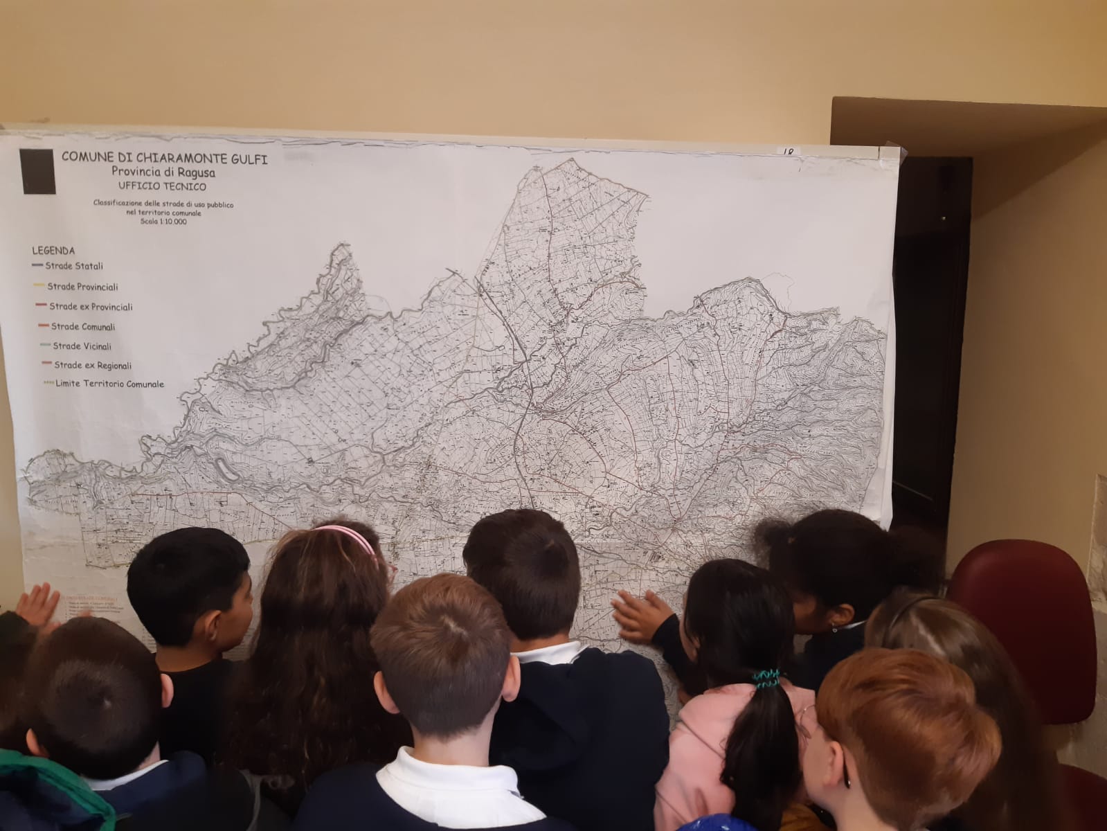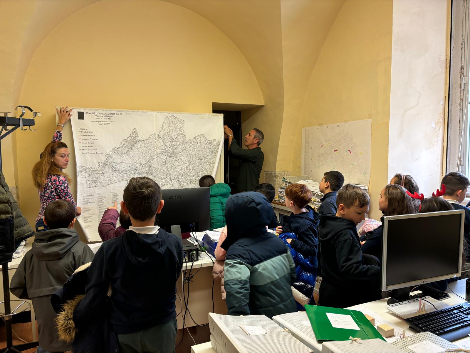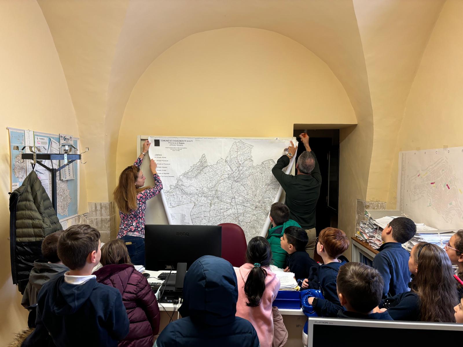 Gli alunni della 3A della scuola primaria del plesso S.Giuseppe, dopo aver studiato in Geografia le carte geografiche, si sono recati presso l’ufficio tecnico del comune di Chiaramonte Gulfi per vedere da vicino le carte del territorio. Gli alunni sono stati accolti dal geometra Maurizio Cannata che ha mostrato alcune carte topografiche di Chiaramonte: sulle strade, sull’illuminazione del territorio, su Villaggio Gulfi, sulla produzione d’olio, sulla provincia di Ragusa,ecc. Inoltre ha mostrato una carta che fa riferimento al piano regolatore del comune. Il geometra Cannata, in ricordo di questa visita, ha regalato la copia della mappa di Chiaramonte ad ogni alunno.
